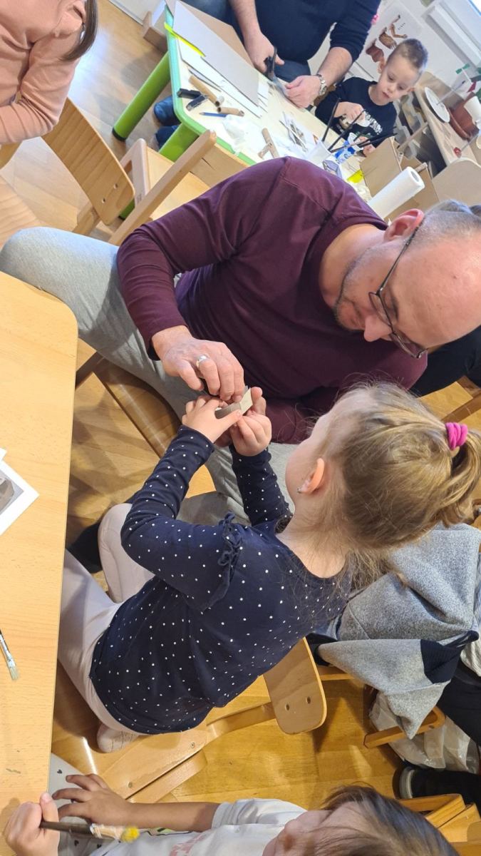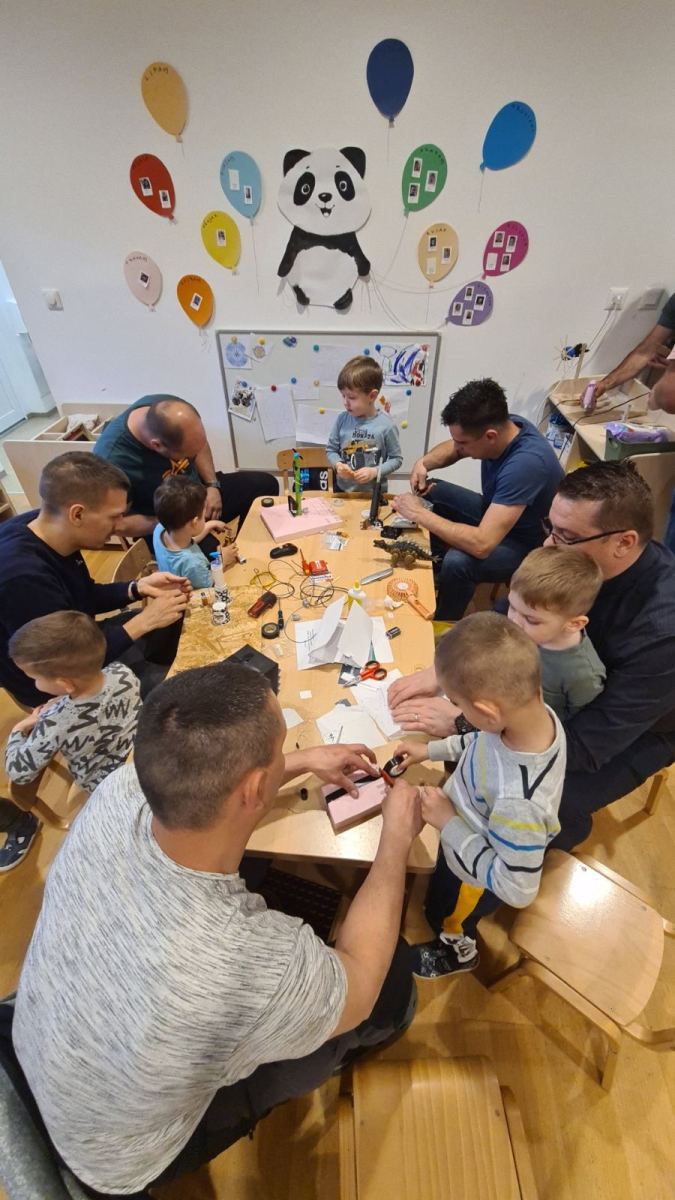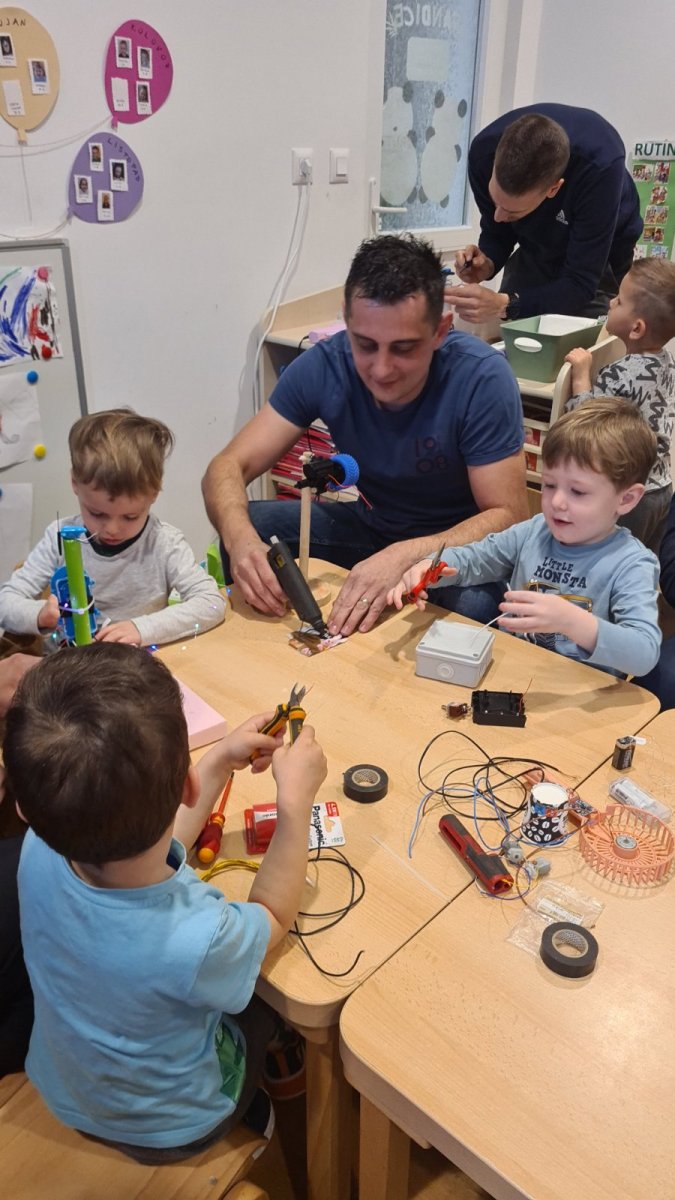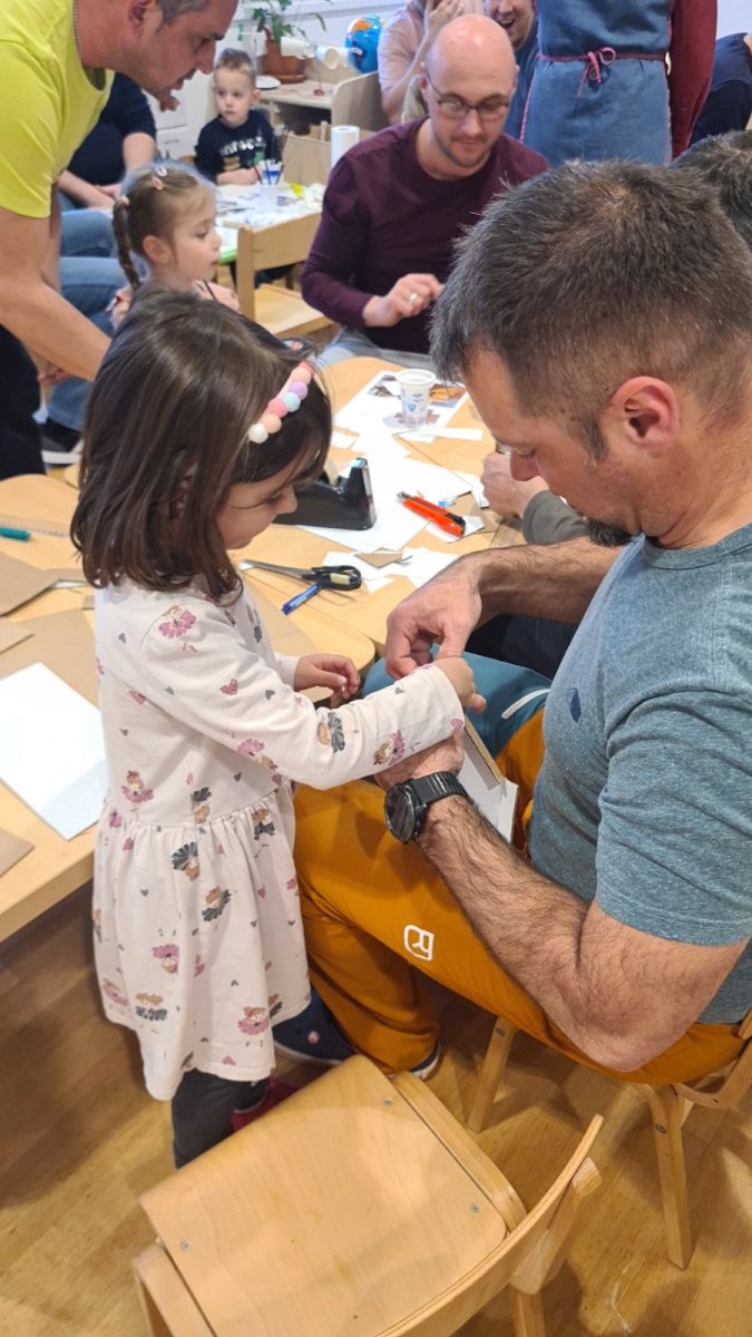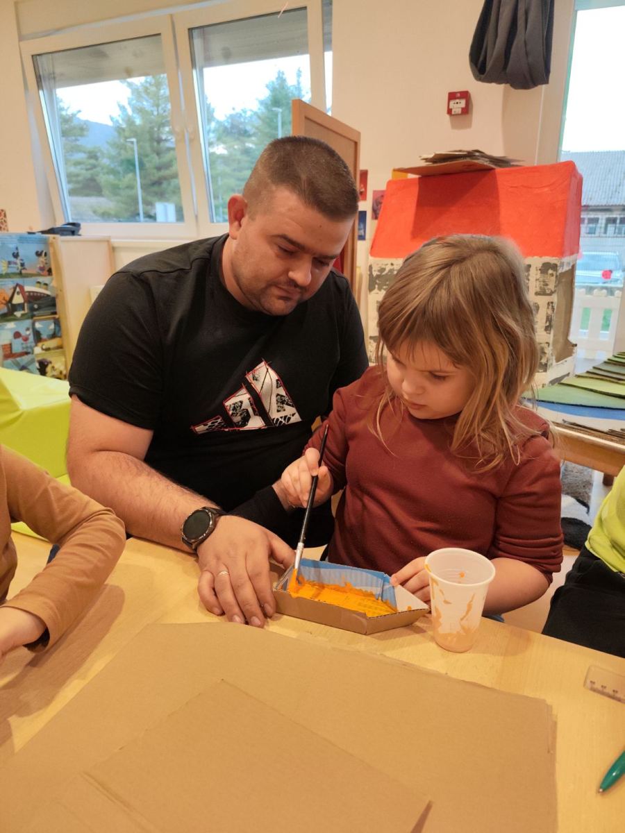U srijedu 18. ožujka u skupini Pandice održana je kreativna radionica očeva i djece. Očevi su se uključili u zajedničku izradu vjetrenjača, trafostanice i brodića kako bi upotpunili izradu makete u sklopu projekta Energija vjetra. Zajednički rad bio je ispunjen smijehom, druženjem i ponosom na izrađene radove. Na kraju uspješne radionice djeca su očevima čestitala Dan očeva uz izrađene poklone.
