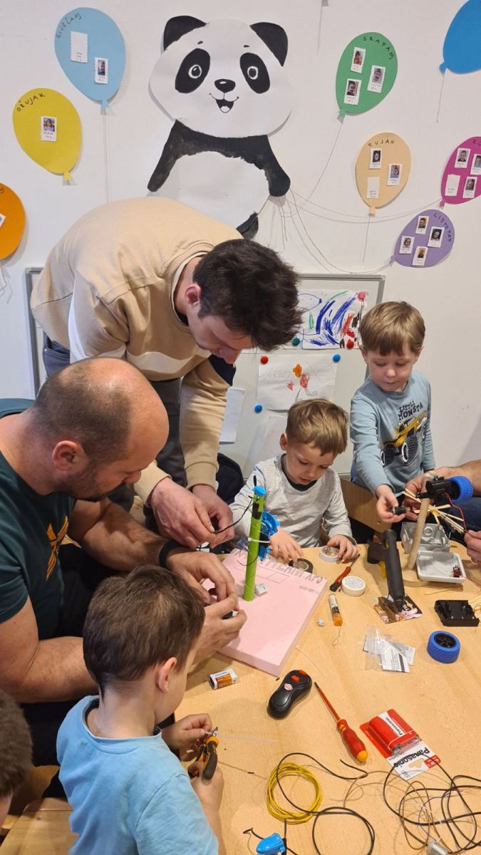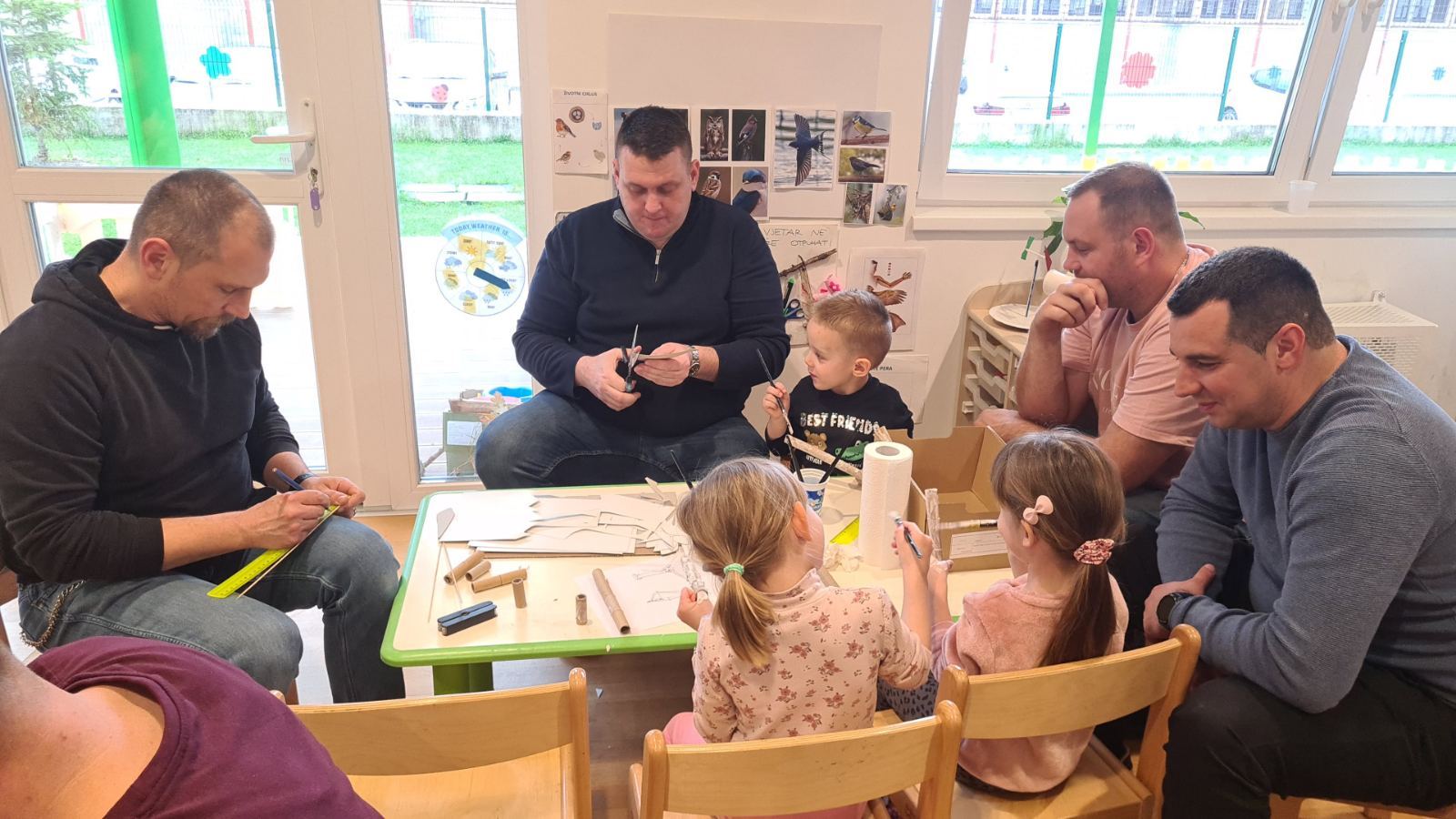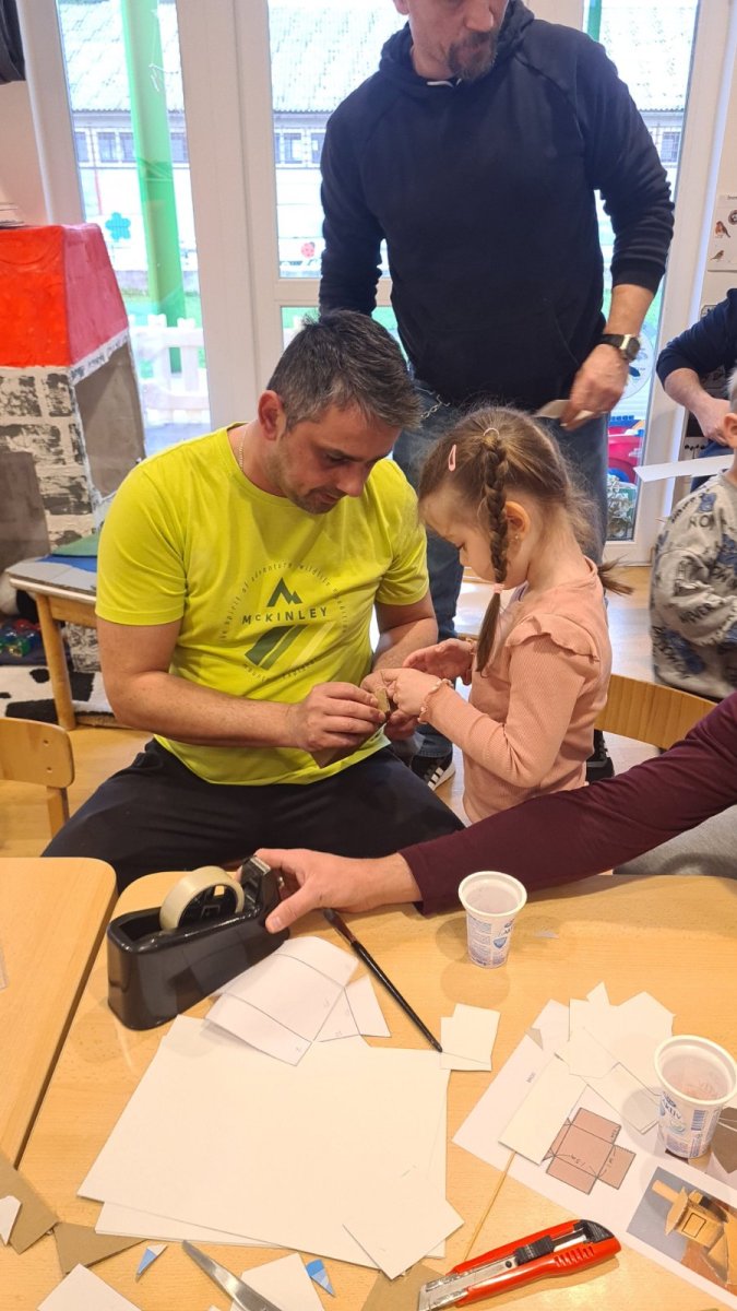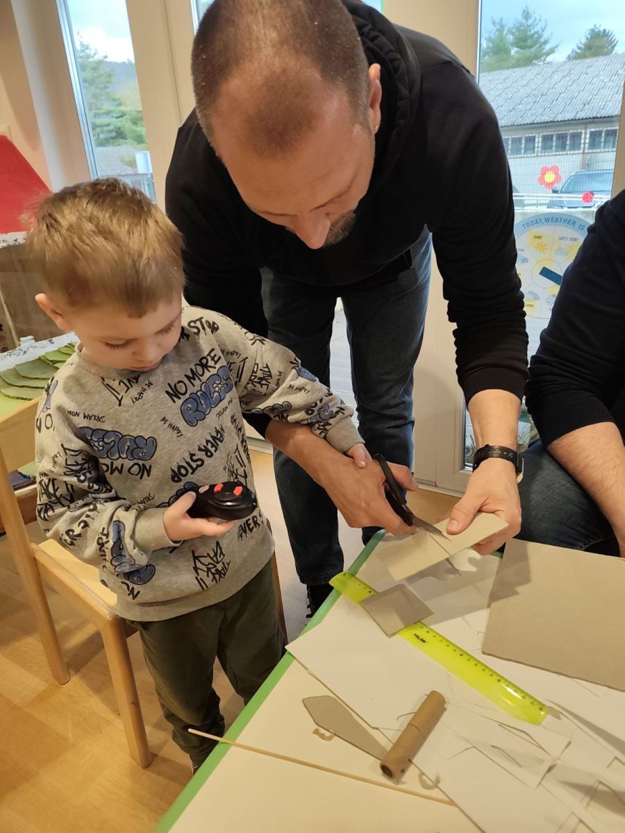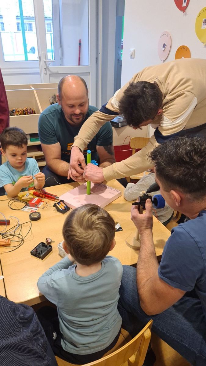 U srijedu 18. ožujka u skupini Pandice održana je kreativna radionica očeva i djece. Očevi su se uključili u zajedničku izradu vjetrenjača, trafostanice i brodića kako bi upotpunili izradu makete u sklopu projekta Energija vjetra. Zajednički rad bio je ispunjen smijehom, druženjem i ponosom na izrađene radove. Na kraju uspješne radionice djeca su očevima čestitala Dan očeva uz izrađene poklone.